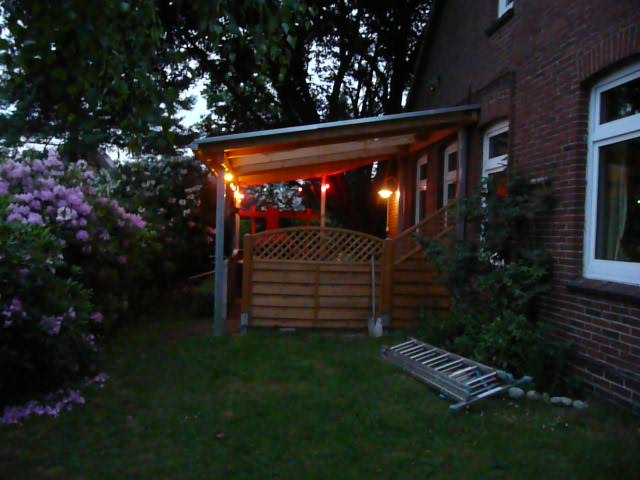 Beleuchtete Terrasse Rote Rosen vor der Terrasse